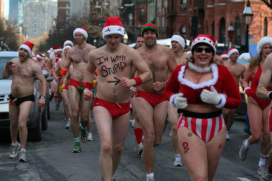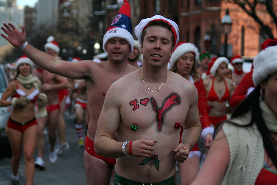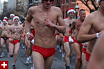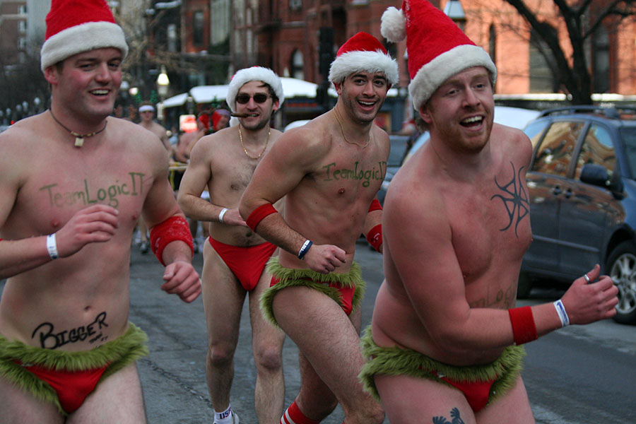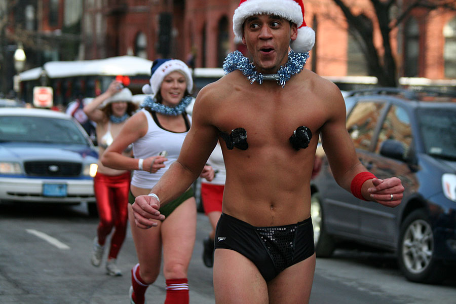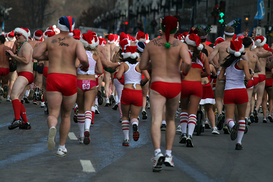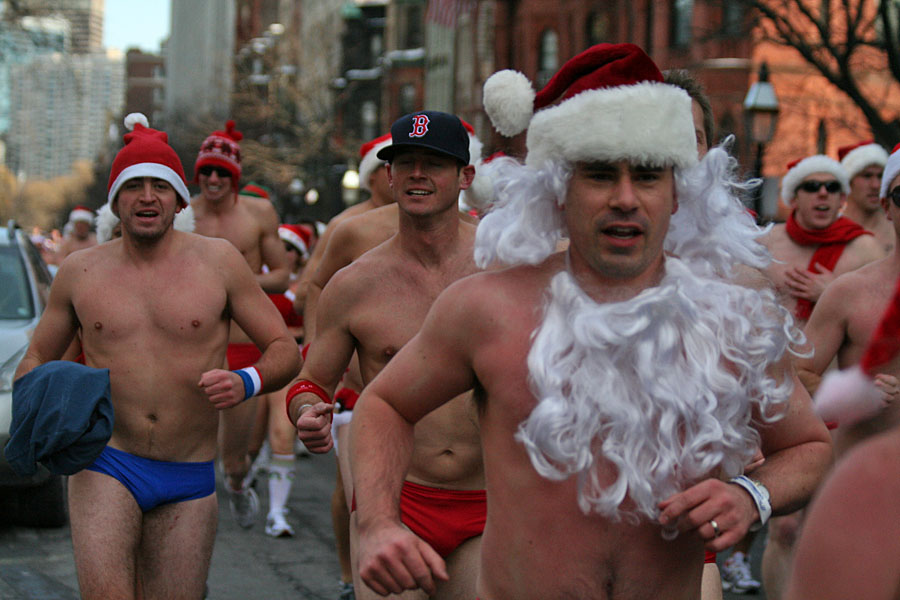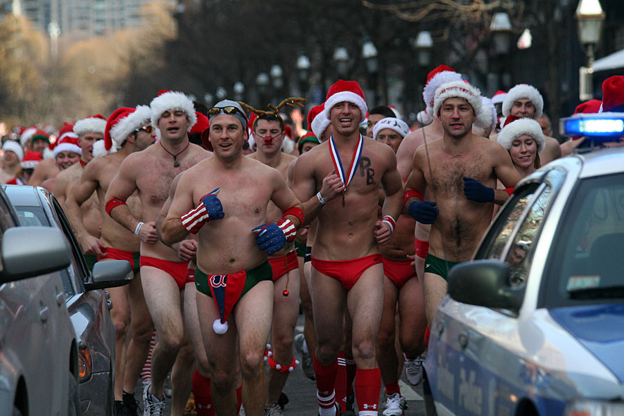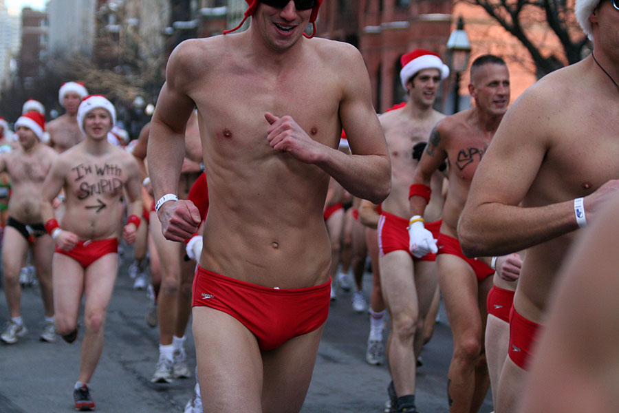 anything that involves men and women wearing skimpy outfits - how could i not be there? such was the case this afternoon for the annual boston santa speedo run in the backbay. it's not just a prank, they actually do raise money for charity. the mile long course stretches both bolyston and newbury street. the event last just 30 minutes, probably less so since it doesn't take half an hour to run a mile (you could walk a mile faster than that). besides, participants wear nothing more than their underwear, so speed is of the essence.