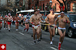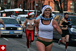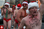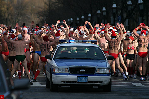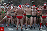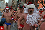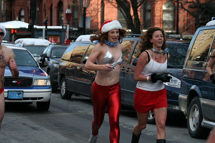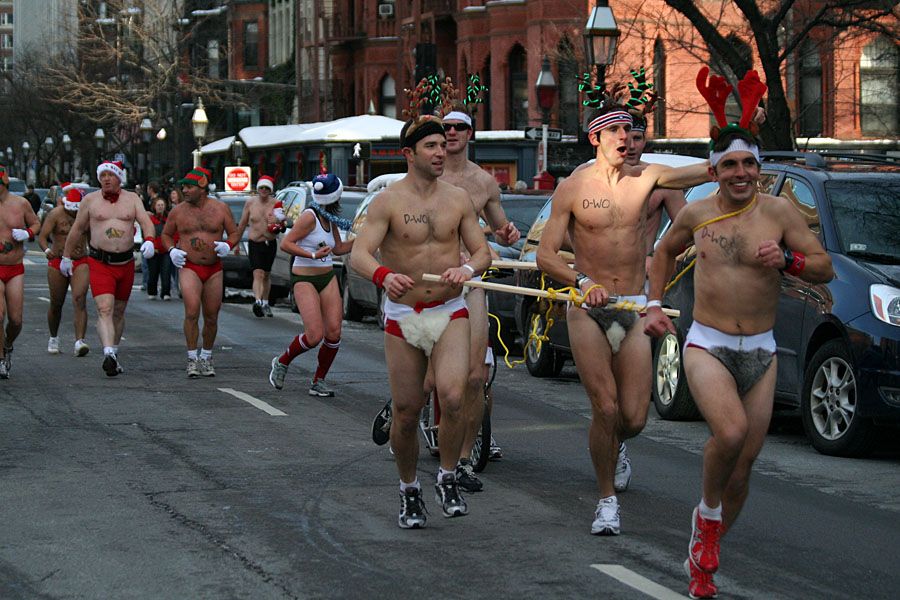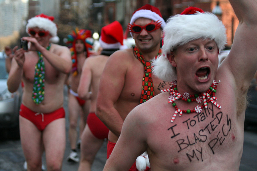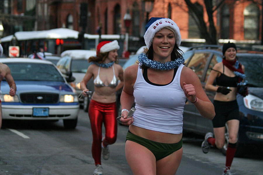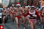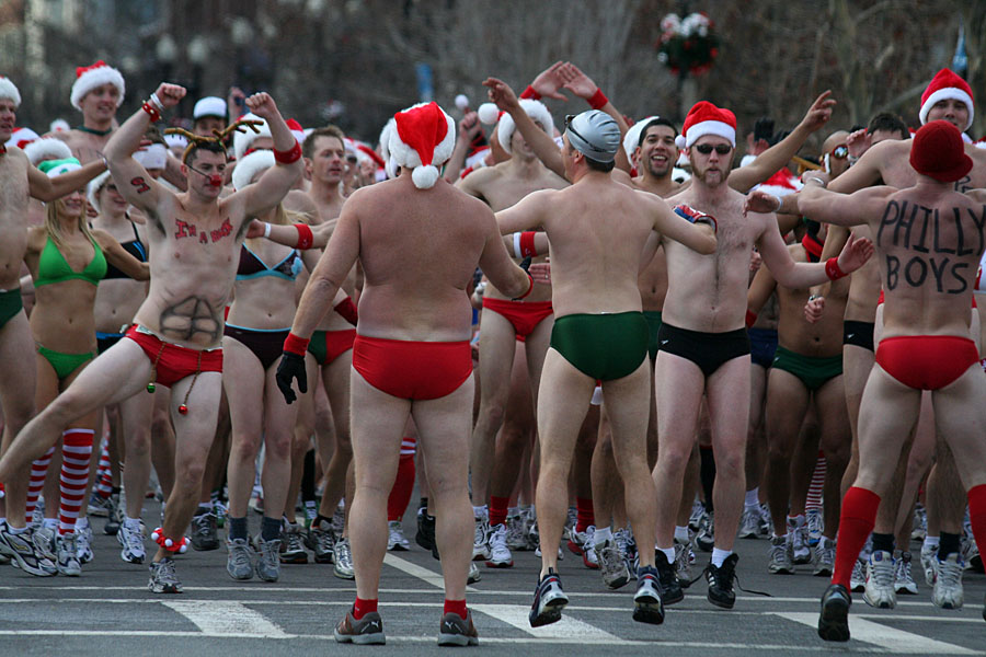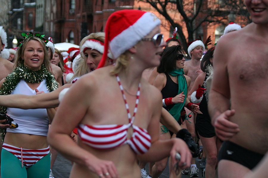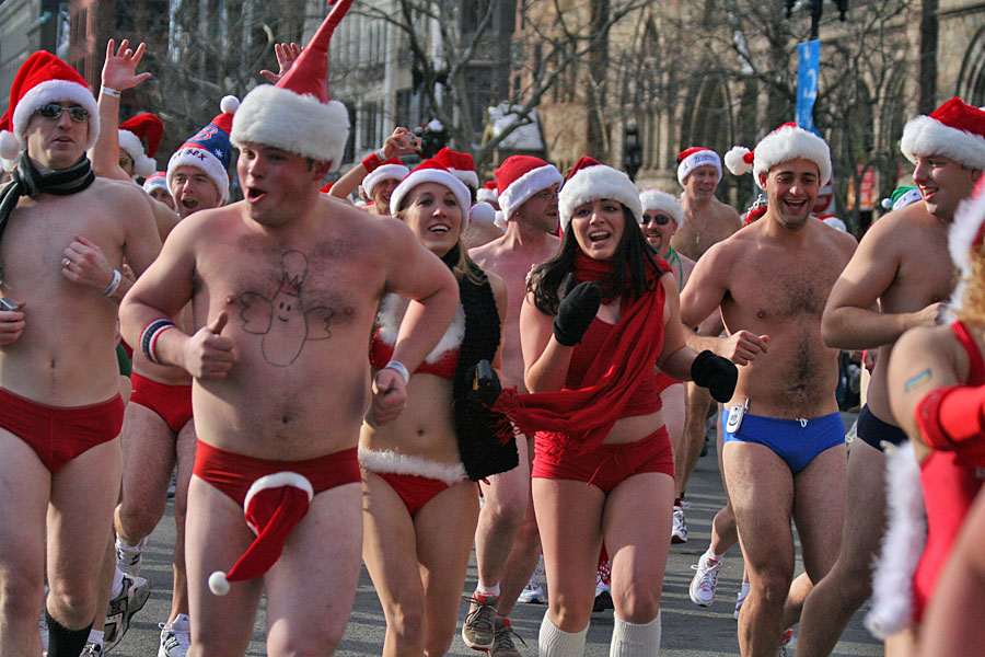 anything that involves men and women wearing skimpy outfits - how could i not be there? such was the case this afternoon for the annual boston santa speedo run in the backbay. it's not just a prank, they actually do raise money for charity. the mile long course stretches both bolyston and newbury street. the event last just 30 minutes, probably less so since it doesn't take half an hour to run a mile (you could walk a mile faster than that). besides, participants wear nothing more than their underwear, so speed is of the essence.