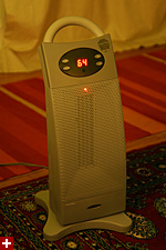 i didn't eat all day and quickly tore into the rotisserie chicken i got from costco. afterwards i checked out the space heater. it resembles a small upright vacuum cleaner, except it rotates automatically on its base 90°. as soon as i plugged it in, comforting warm air started blowing in my living room. i can either set the temperature or just have it manually blow hot air (two settings, low and high) into the room until the safety switch automatically turns itself off. there's also a timer feature for auto-restart or auto-off. i had it turned on in the living room, but that probably wasn't a good idea because it was too close to the thermostat so my heat never came on, leaving the rest of my place cold (i guess that could also b a good thing though).