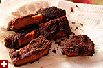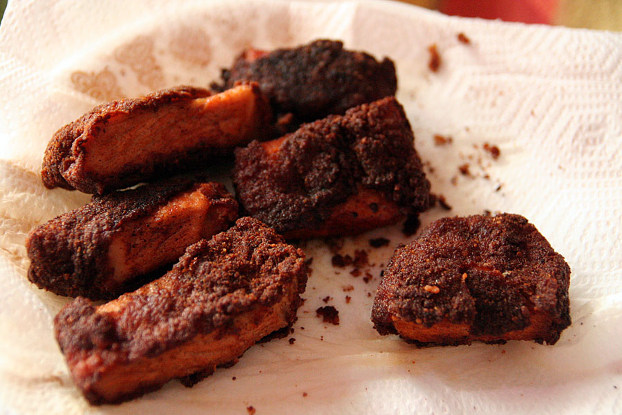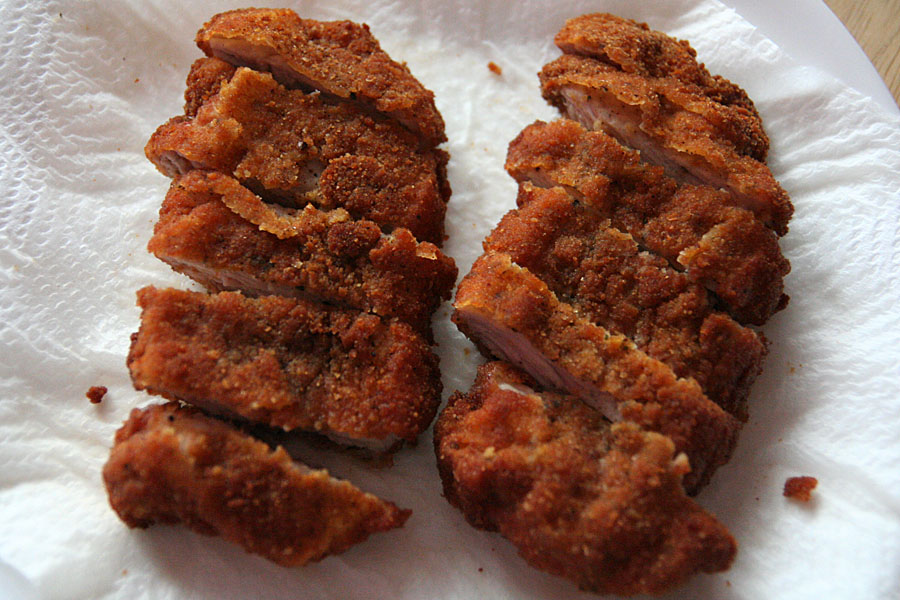 they were still raw. i ended up cutting them up into slices and re-frying them. the final results looked more jerky than cutlet, as i fished them out and placed them on a napkin on a plate to soak up some of the excess oil. on my second attempt with the last two cutlets, i actually turned off the heat and let the cutlets slow cook in the oil. these turned out much better, although still a poor facsimile to the tonkatsu you'd find in restaurants.