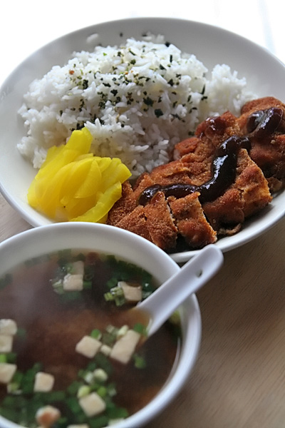 i spent most of the day in my bedroom. with the space heater turned on for just 30 minutes, it warmed up my room well enough to last several hours. i turned it once in the morning (11am) and then once more at night (6pm). it got so hot in my room during the day that i was having problems breathing. the heater has a distinctive smell, that of warm (not melting) plastic. it's the same smell as my macbook pro if i hold my nose close to the keyboard. i only ever ventured out to the living room to check on my mail and to close the blinds. for dinner i had more tonkatsu.