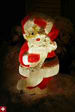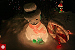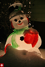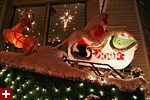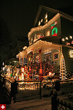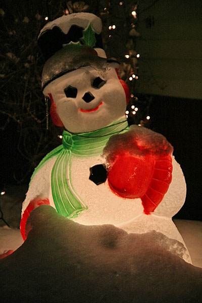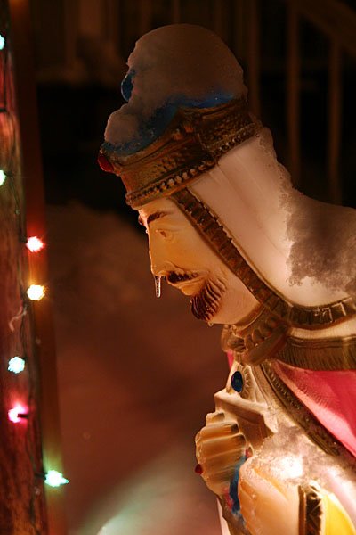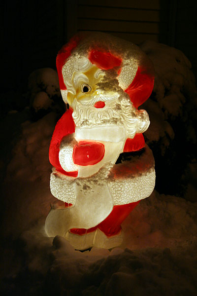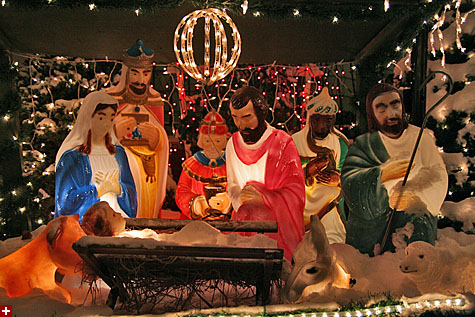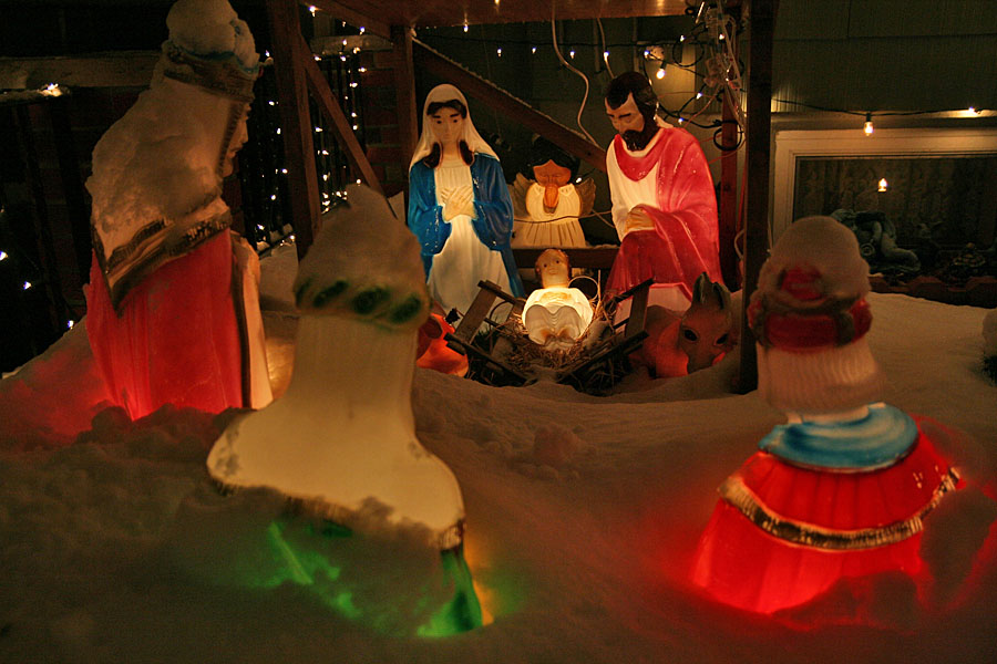 i love the fusion of the religious with the secular and the commercial. some houses are so gaudy in their hodge podge of various holiday symbolism that it's an absolute feast for the eyes as well as the mind as i try to decipher their interpretation of christmas. you got your manger scene, and then you have your standard issue santa claus. there are the winter motifs, like snowmen and snowflakes, and the holiday decorations, like candy canes and gingerbread men. then you have elements from christmas stories or songs, like the little drummer boy. added to that the commercial components, like the disney characters. even gungho patriotism sneaks in there, with dedications to our troops and much banner waving. there's just something so american about all these different kinds of christmas presentation, a real melting pot of the best and worst of christmas.