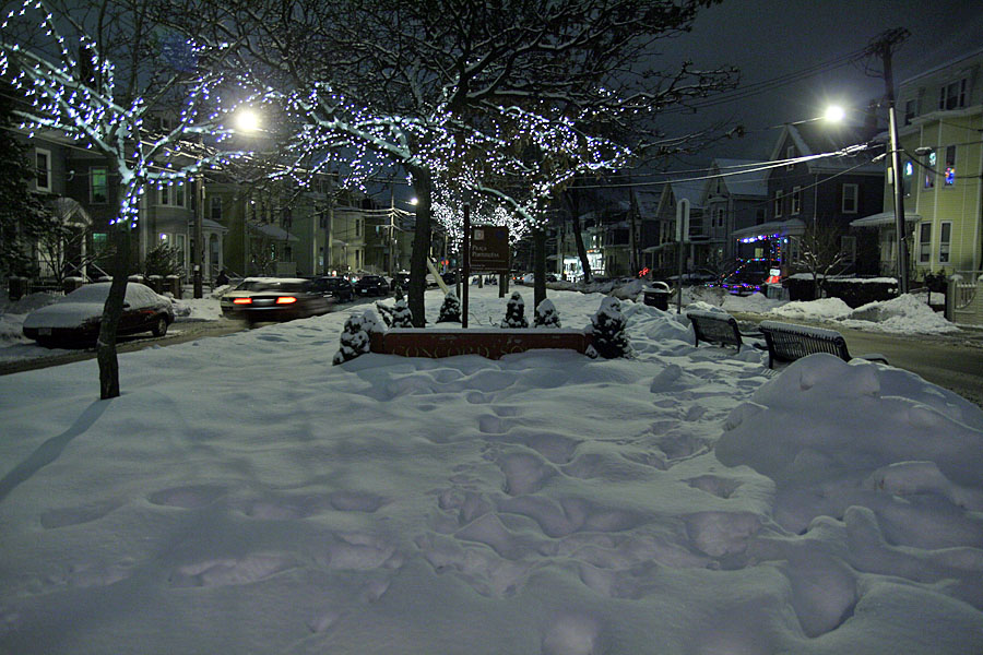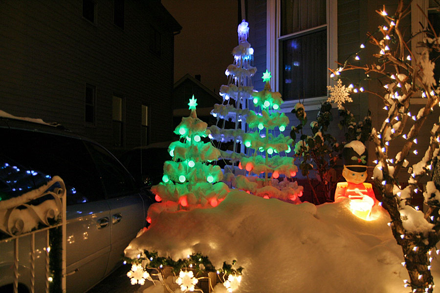 this house on magnus avenue was a new one for us. it was the only house on the entire street that was decorated, and decorated with the glitziness of a las vegas casino. it was so bright, neighbors digging out their snow-buried cars could probably used the illumination to see. though julie said she never saw it before, we noticed a lot of chairs in empty parking spots, local residents reserving their hard-earned spaces (many a fight in boston have been started over winter parking spots). we also saw a meter maid going around ticketing cars; julie said in somerville you can be fined if you don't dig your car out of the snow with a certain time period. that apparently is not the case in cambridge where i have neighbors with cars buried underneath 3 separate snowstorms.