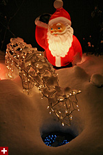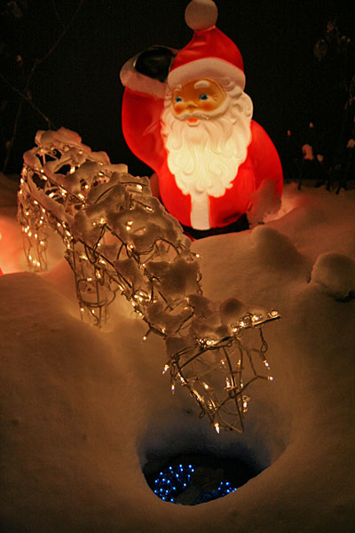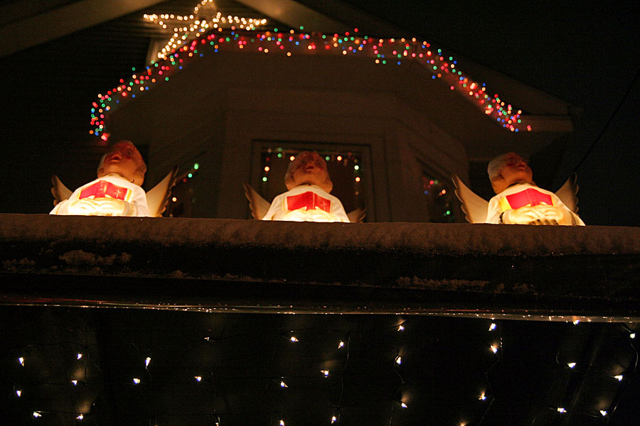 we past a few houses that seemed to have a lot of decorations but none of the lights were turned on. for instance, the infamous homemade animatronic house on central street was disappointingly dark and silent. it seems strange, so close to christmas, that these homes should remain unlit. but with christmas happening next tuesday, it's probable that some families have taken an extended long weekend - particularly if they're doing any kind of long distance traveling - so it's a good chance nobody's home (nevertheless - haven't they heard of automatic timers?).