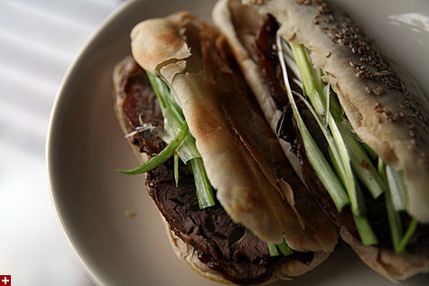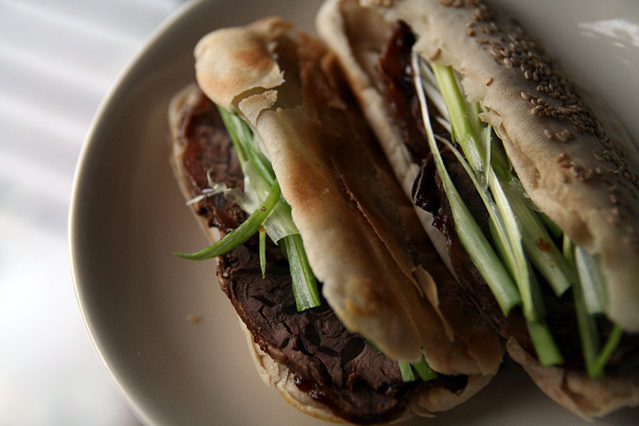 my parents made one of my favorite things to eat - shao bing jia rou (烧饼夹肉) - and delivered some to me early this afternoon for lunch. it's pretty much a crispy bread with a pocket stuffed with braised beef and some scallion strips. just those three simple ingredients can take me to an epicurean bliss. i had enough for dinner as well and eagerly waited for evening to arrive.