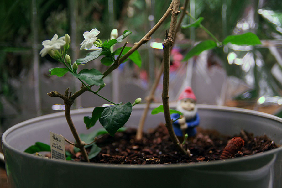 later i saw the jasmine plant in the makeshift grow house my father had set up at the back of the cafe. that jasmine was just barely clinging on to life when i returned it to my father, but now it was thriving, sprouting new leaves and even flowering a bit. my father bent back the long stem and replanted the top portion. i think a lot of the success has to do with the grow light though - the natural light in the back of my kitchen is just too dim to sustain sun-loving plants (even shade tolerant species can't tolerate that much shade). makes me wonder what floral miracles i can achieve if i upgrade the lights in my fish tanks to something with more wattage.