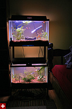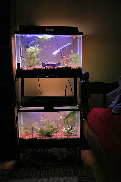 i decided to move my double decker aquariums into the guest bedroom. at their present location they're actually in the direct path of some morning sunlight so i've been getting some really serious algae bloom. it took a while to move, since i had to drain half the water first. even then each tank weighed about 50 lbs. that's 50 lbs. of glass and sloshing water, which makes for a very heavy and fragile combination.