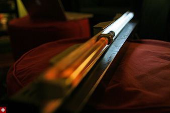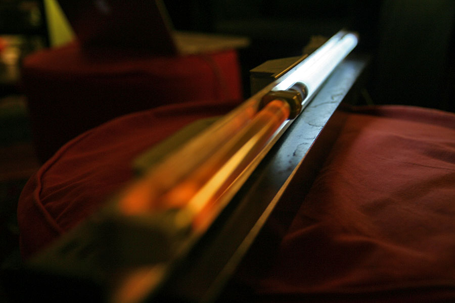 my father gave me the guts of an old illuminated sign when i returned home. inside was a T5 fluorescent housing. i rewired it haphazardly with some duct tape so i could plug it in. there are actually two bulbs, one longer than the other, with the shorter tube burnt out and with an orange flicker at best.