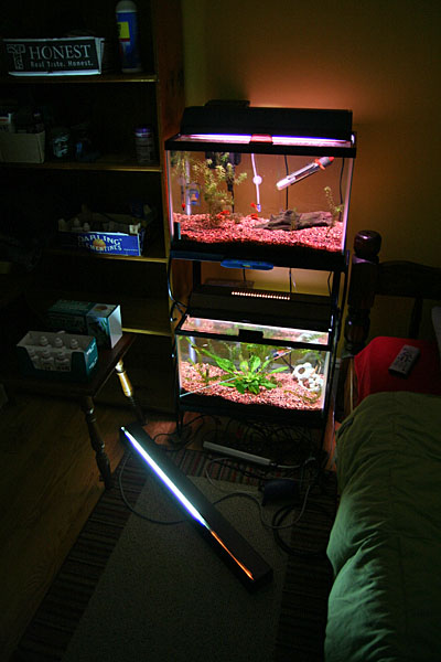 my original plan was to retrofit everything into a custom-built aquarium hood, but the most usable tube was 20" long, slightly extending the width of my 10 gallon fish tank. looks like i'm going to have to wire my own lights using standard screw-type compact fluorescent bulbs and fashion my own hood out of wood. all this to increase the light production in my fish tanks so i can better grow my aquatic plants.