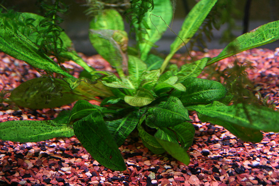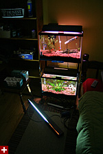 i ordered about $50 worth of aquarium supplies from doctor foster & smith tonight, one of them being some new lights. the fluorescent light on my minibow went bad a few days ago with intermittent flickering. deducing that the problem had nothing to do with the starter, i figured it was the bulb, which displayed characteristic dark bruising on one end of the tube. i ordered an flora-glo (blue shift) for the male tank and an aqua-glo (red shift) for the female tank. the female tank currently uses an aqua-glo and the plants seem to be doing okay. i wouldn't say they're thriving, but they seem to be stable and far better than the male tank.