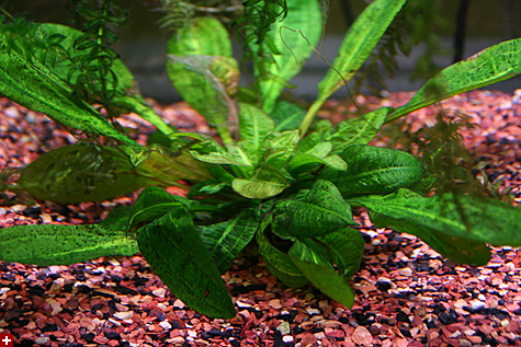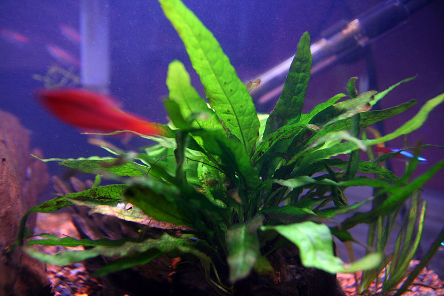 as for the minibow, it's currently temporarily using the all-glass fluorescent light, which i now realize is virtually useless for growing plants (with light spectrum in the yellow range). i ordered a GE aqua rays fresh/saltwater light for this tank, which is what it had before. i would've liked to have tried something different, but the light seems to work, at least for the java ferns, which are doing surprisingly well, even managed to sprout a few new leaves. every once in a while i tank the ferns out of the tank (attached to their driftwood substrate) and wash the leaves, rubbing the dark algae off between my fingers. ever since i gave it a piece of driftwood to grow on, it's done so much better (it used to just grow loose in the gravel). the few buds that've sprouted i've removed and transplanted on the larger driftwood piece. i need to get more plants like the java fern, low maintenance and doesn't require too much light.