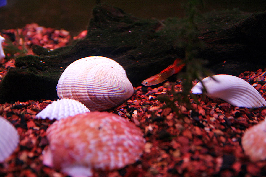 another partial water change today in the male guppies tank. i threw in a handful of empty seashells hoping to increase the hardiness of the water and thereby raising the pH level as well. i also did a water change in the minibow, skimming the oil off of the surface (it happens whenever i do any sort of cooking in the kitchen).