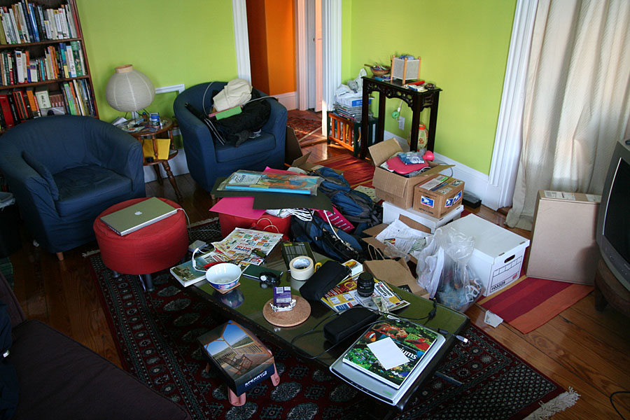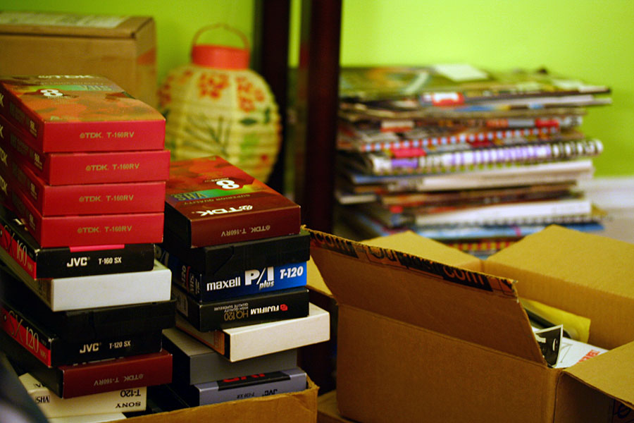 a fifth of all my stuff are actually old VHS tapes. as recent as just a few years ago, i was obsessed with taping shows that i end up never watching. now i never use my VCR anymore, except to tape a sports game if i can't be home to watch live. but just the fact that i still sometimes use a VCR probably makes me a dinosaur, a relic of 20th century technology. nowadays, i don't tape shows anymore, but instead pull them off the internet through P2P sharing. they look just as good as on TV but minus the commercials and they end up being files on my computer that i can either throw away or save and watch again. reading what i just wrote, you can probably guess that i'm not up to speed on all this HD technology. i've seen HD broadcast and it looks amazing, and hopefully one day i can afford to upgrade my TV (as well as my cable service), but in the meantime, regular analog style TV is good enough for me, with the occasional digital downloaded supplement. as for all those VHS tapes, maybe on a rainy day i'll look through them. in my parents' basement i have several more boxes of tapes, shows i've taped from the 80's. maybe one day i can convert them to digital files and finally clear out some space.