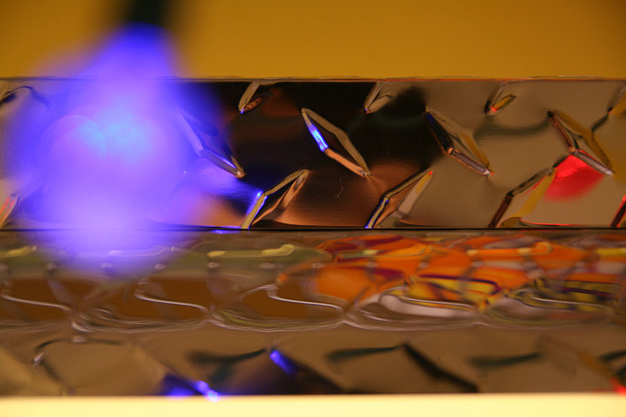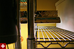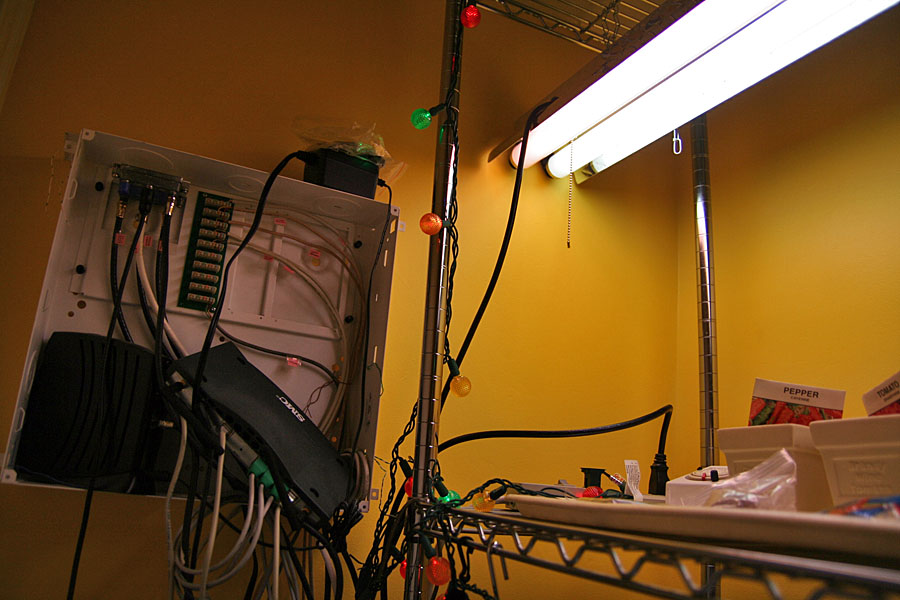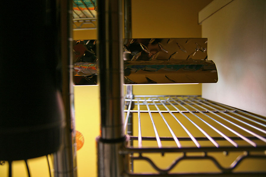my father helped me set up the shop light inside the closet. it was a little bit longer than anticipated, poking a few inches into the neighboring shelf. with both bulbs installed, it was so bright in my closet that it felt like daylight. i think i might replace the natural sunshine bulb however; i don't think it's blue enough (i want something in the 6700K range).