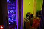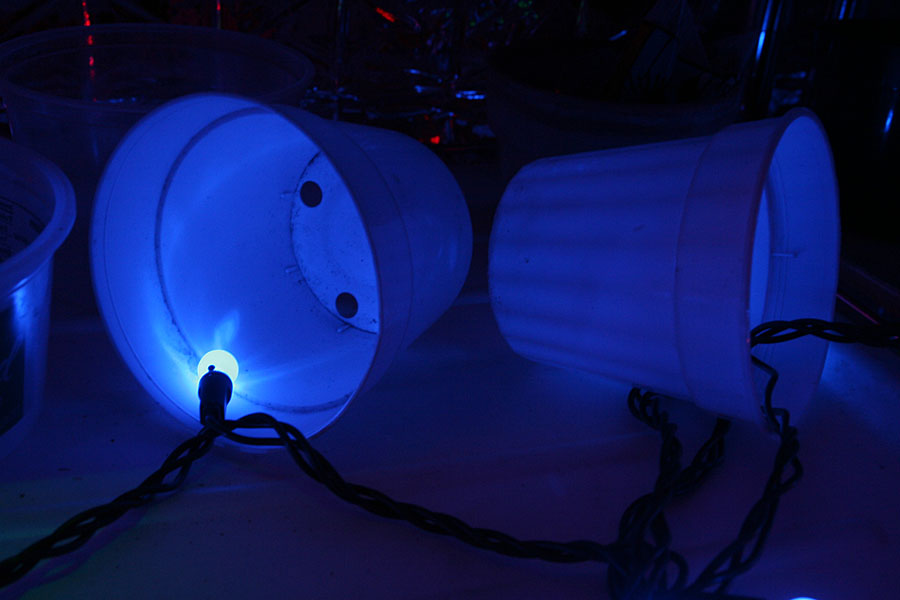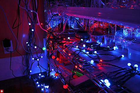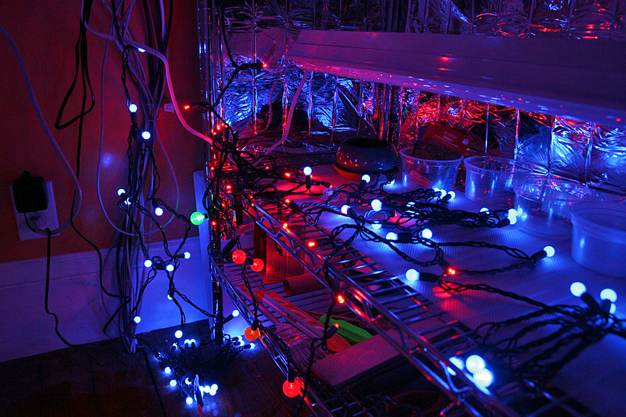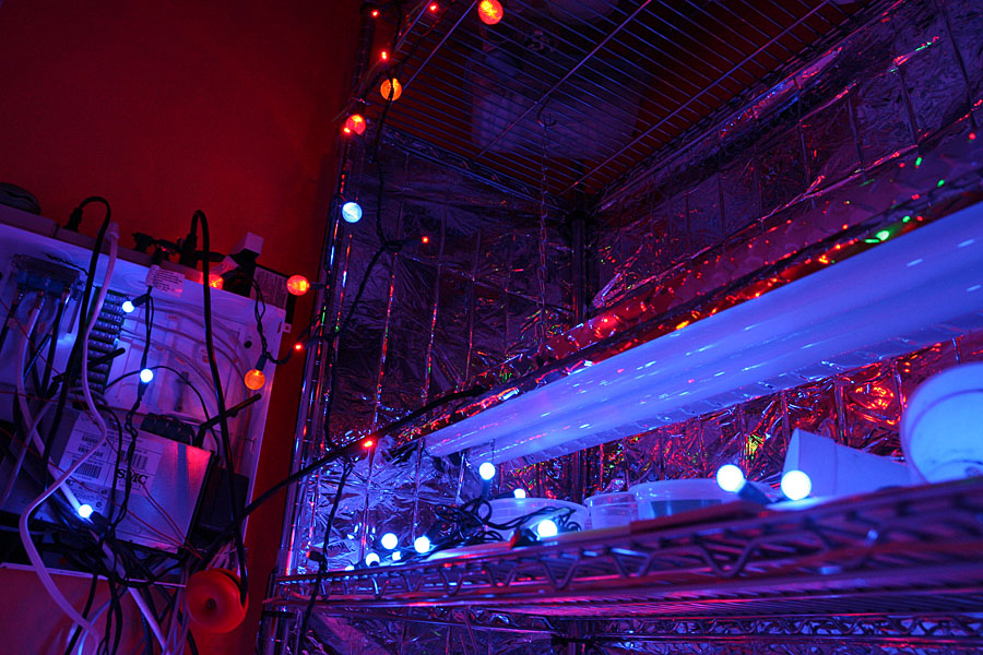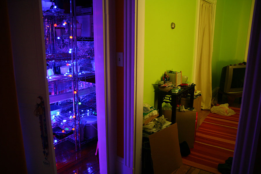 i still haven't figured out how exactly i'm going to use these LED's for growing since i'm already set up for fluorescent lighting. i think i have to make some sort of board and poke through each LED light to create a mosaic of LED's. i left the lights on in the closet: the combination of red and blue produced a purple glow.