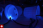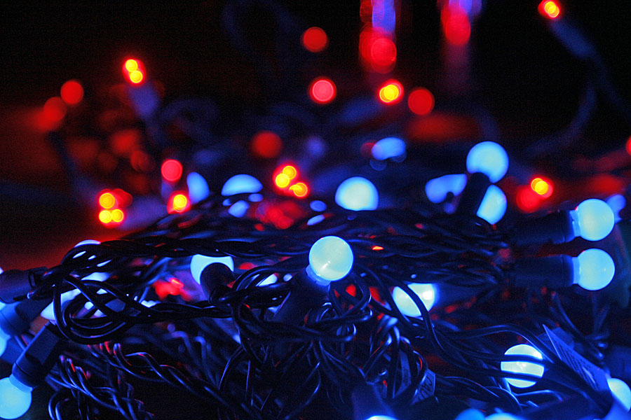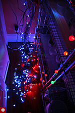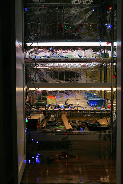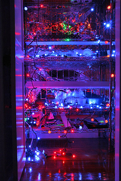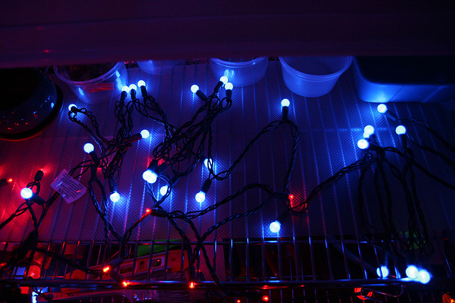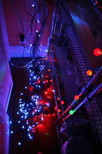 in the late afternoon a package arrived on my doorstep. i thought maybe it was my amazon books but instead it was my order of LED christmas lights. i quickly took them into the closet and plugged them all in: 105 blue LED's and 50 red LED's. it was pretty impressive, like a closet full of lightning bugs or a sea of stars.