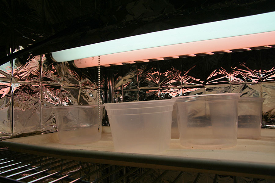 after thinking about it last night, i went ahead and wrapped the outside of my grow shelves with mylar (actually just a 53"x82" coleman emergency blanket). why mylar? it's just a way to recycle the light, bouncing it back onto the plants. i could use other reflective surfaces but mylar is the best, reflecting 90-95% of the light (matte white paint reflects only 75-80%, while aluminum reflects just 60-65%). maybe it was just wishful thinking, but the area felt warmer once i surrounded it with the shiny stuff. it felt like the inside of one of those fancy science laboratory. i still need to collect more potting containers before i can start growing, and i may also need to figure out a better potting mixture for my eventual seedlings. doing some reading last night, i found out that seeds germinate best in warmer conditions.