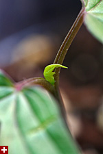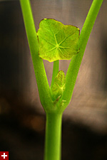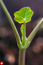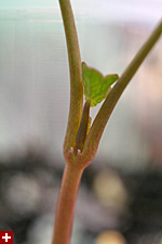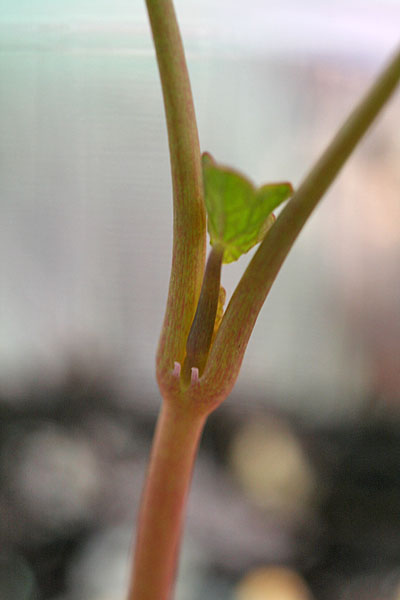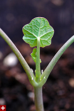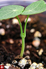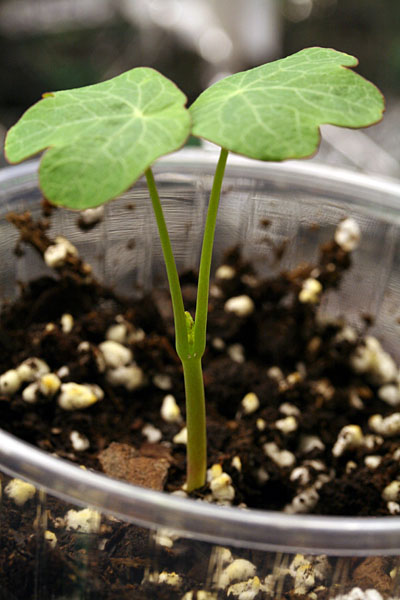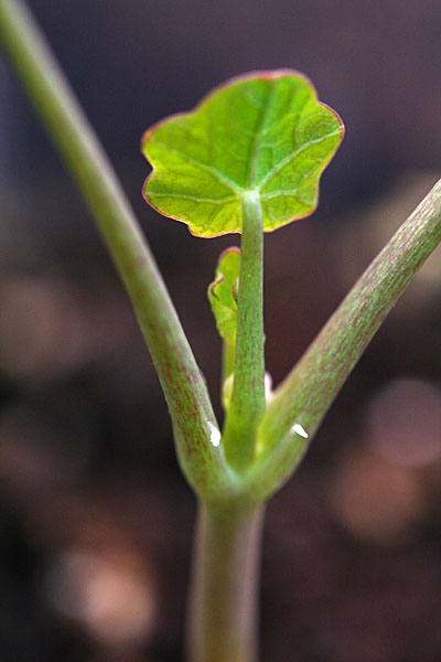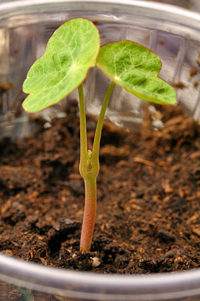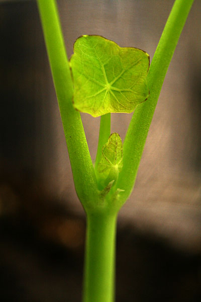some nasturtiums have reddish mottled spots on their stems, while others are completely green. the ones with the red spots are more compact and have flat leaves while the green stemmed variety grow skinnier and taller with broader leaves. the spurs on the red spotted variety are white, while the green variety are yellowish-green. checking the package that the seeds originally came in, it said they were a mix (although it didn't specify which varieties). looking back, not all the seeds looked the same, some were bigger, while others were smaller and dark. the smoking gun was a photo i took last night but didn't quite connect the dots yet. for some reason the nasturtium growth wasn't consistent: shorter varieties - which i thought were a result of the type of lights i used - were appearing on the bottom shelf using brighter bulbs, and likewise the assumed taller varieties from the bottom shelf were showing up on the top shelf.