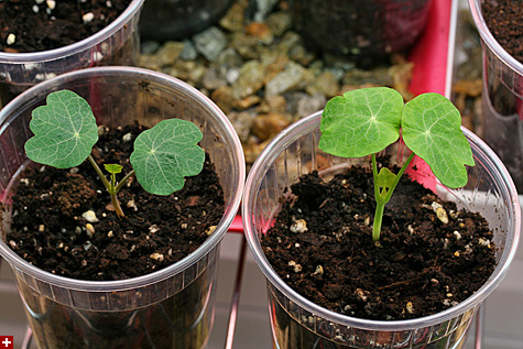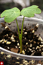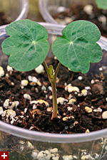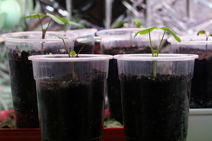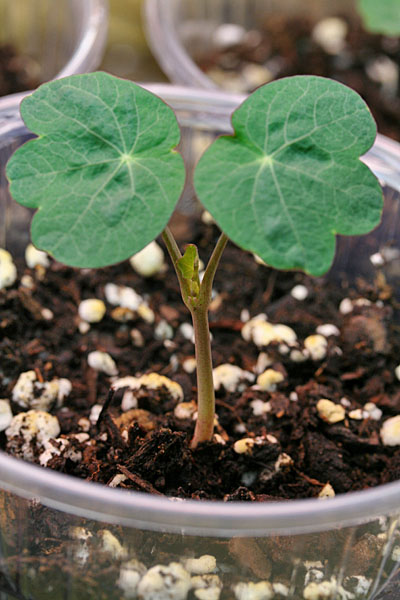 while all this plant growth is happening above the surface, there's a lot that's happening below ground that i just can't see. i was a bit curious and looked around the sides of the plastic cups for signs of the growing roots. sure enough, there they were. it's kind of scary to see how long the roots are already, especially the nasturtiums, which are growing so fast they could be considered weeds.