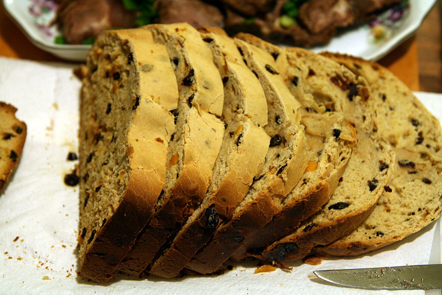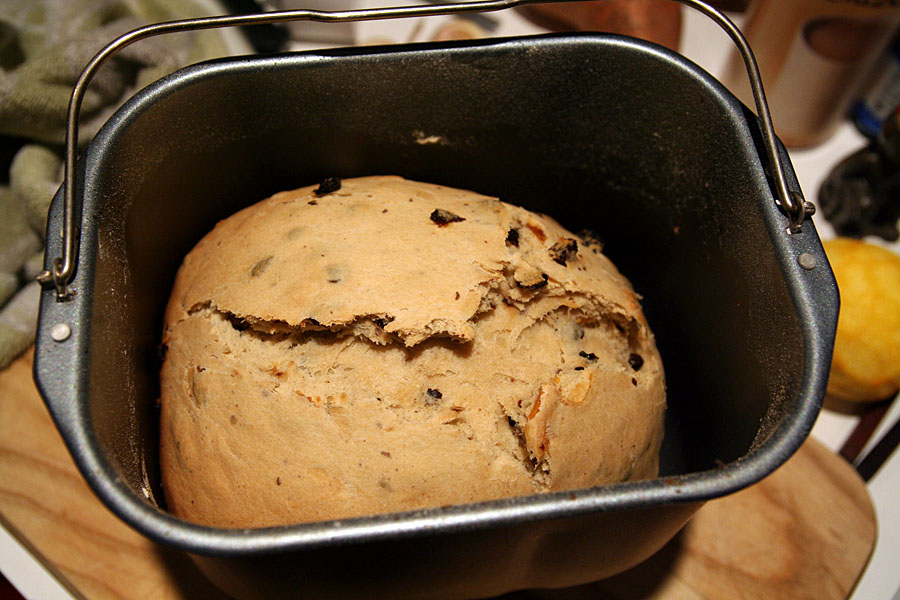 not sure what happened: during the dough-making process things looked good, a perfectly round ball of protobread, unless the last time when it was a soupy sludge that never coalesced into solid shape. however, during the rising phase i noticed the dough wasn't doing anything; specifically, it was rising, but rather just sat in the bread machine tub like a dead thing. the baking stage puffed it up a bit, but it was a disappointment. i gave it to my parents when i drove over to their place for dinner.