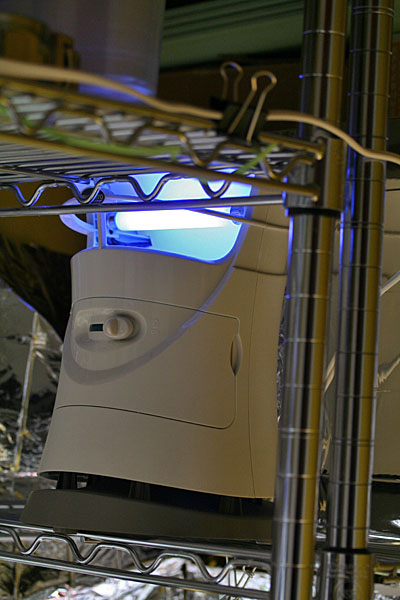 another thing: i have to run it at nights, otherwise my regular fluorescents are too bright and will overshadow the UV lamp. i'm not sure how well the nosquito will work: amazon.com sells the same thing and user comments have either been "this is a piece of junk" to suspiciously overglowing reviews. i guess i'll find out for myself. if nothing else, it's a good source of much-needed air circulation (i don't know how long i can run my little battery powered usb fan, and my other fan won't fit inside the tight confines of my grow shelves).