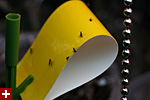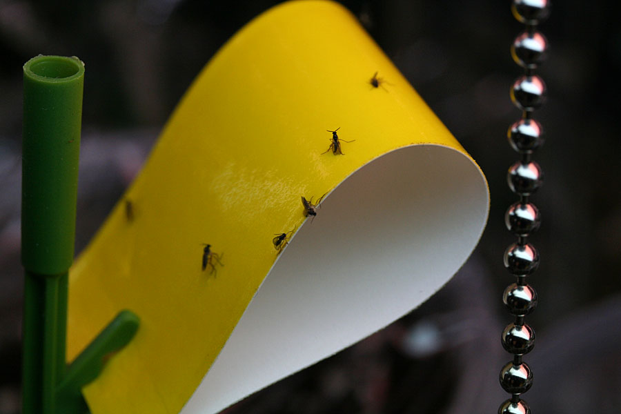 later in the evening i rechecked the traps before going to bed. for some reason they all seemed to congregate on one particular trap, the one on the far left top shelf. that trap alone caught 8 fungus gnats, while another one caught 2 and a third caught just one. the 2 remaining didn't catch any.