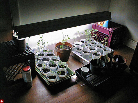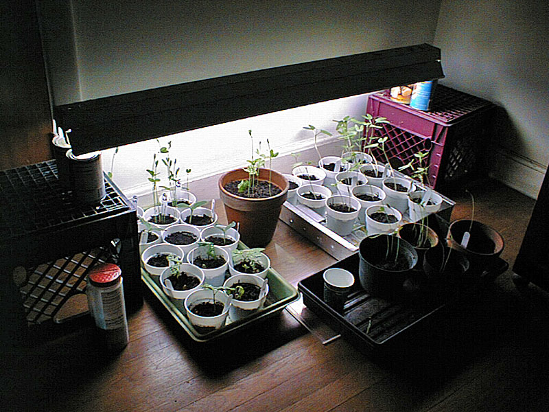 while rummaging through my old photos i came across one from spring of 1998, a fine early example of indoor gardening. it was back when i still lived in belmont and goes to show you that you don't need fancy equipment to start growing plants indoors. doing have a metal shelf to suspend your lights? use milk crates and cans! from the photo it looks like i'm growing some morning glories, moonflowers, snow peas and maybe some cucumbers.