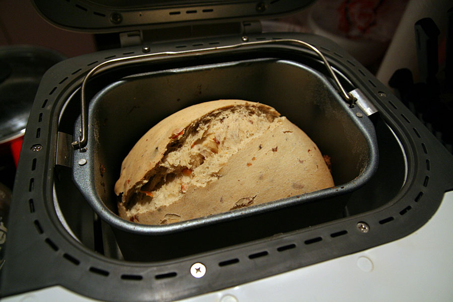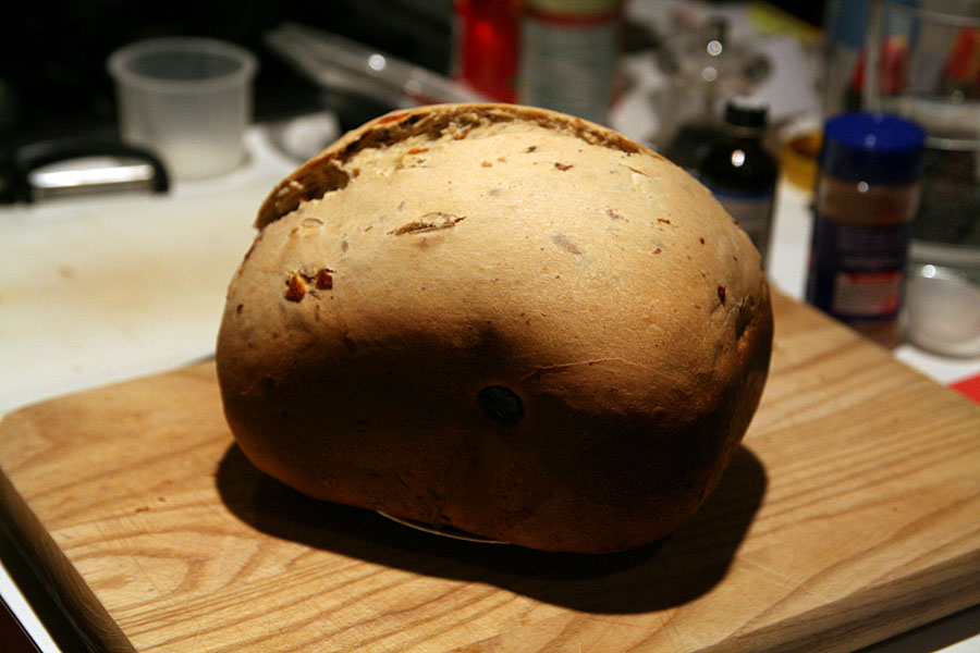 i made another attempt at making a good loaf of bread before i went over to my parents' place tonight. once again it was raisin-orange bread. pretty much the same ingredients as last sunday, except this time i used 4 cups of flour (i used 3 last time), water that was left outside for a few days (to evaporate the chlorine from the tap water) and 2 teaspoon of the fast-rising yeast. during the initial dough-making phase things looked good as the bread machine window fogged up from the activity happening within. however, during the rise phase, i began to have doubts that this would be a good bread. the dough wasn't really rising and things didn't look right. in the final hour during the baking phase, the bread puffed up but it wasn't really getting any bigger and it split down the middle. the final bread was just as dense as last weekend's bread, and there was still some raw dough in the very center of the bread (not as much as last time though).