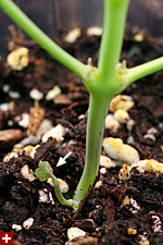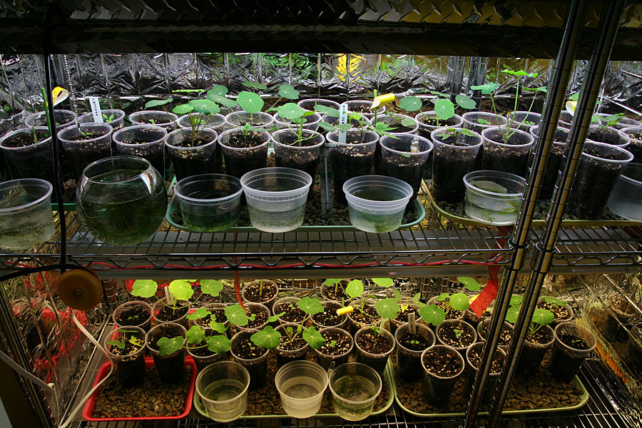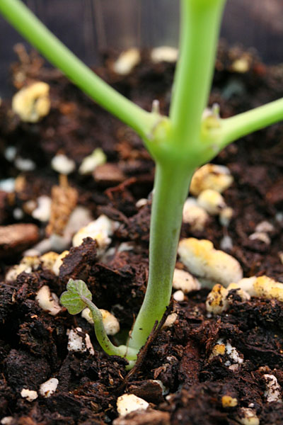 since i only recently removed all the saran wrap covering. i haven't done any internet research on it yet, maybe it's something else. i don't think it's a water issue because the soil feels pretty moist. 2) the spindling tall nasturtium on the top shelf has sprouted a small branch with a leaf from one of its roots. i didn't even realize they could do that. not sure what it means though.