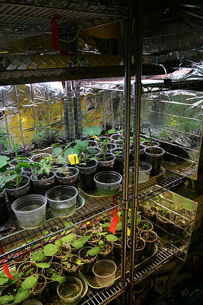 with my father's assistance, i raised the fluorescent lamps inside my grow closet. the light on the top shelf can go even higher, but the one on the bottom shelf is already at its maximum height.