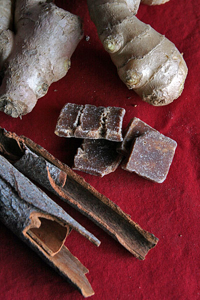 my parents made this spicy and sweet cinnamon tea about a week ago that i tried reproducing this afternoon. the ingredients are simple: boiled water, brown sugar, a crushed piece of ginger, and a piece of cinnamon - in this case chinese cinnamon, which is just the bark of the chinese cassia (i bought a bag yesterday in chinatown for less than a $1). at first i used half a cup of sugar, but it didn't taste sweet enough so i added another half cup. it still wasn't the same and i probably need to add more sugar and/or cinnamon. the ginger is only for show and i couldn't taste it at all. afterwards the house smelled like cinnamon for the rest of the day.