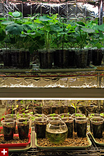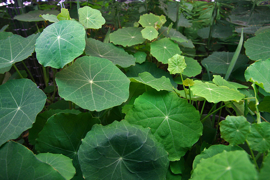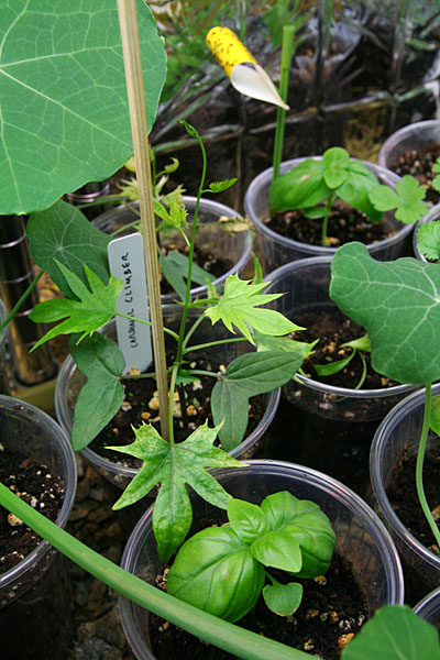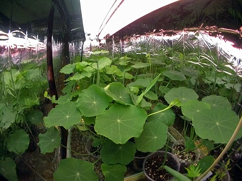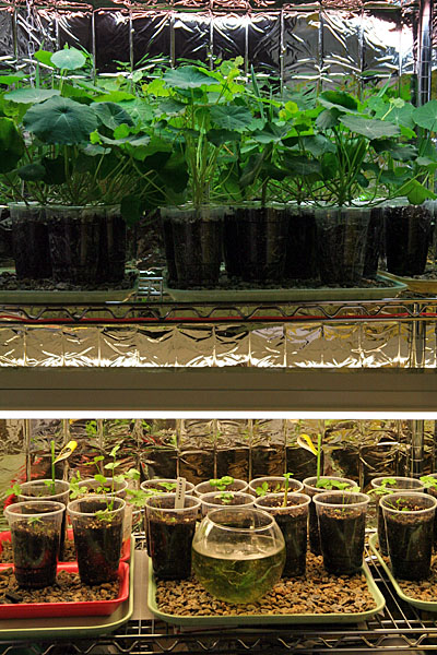 today i moved all my tall plants (nasturtiums, scallion, garlic, cardinal climbers) to the top shelf while relocating all the short plants to the lower shelf. i also dropped down the fluorescent lights on the lower shelf so they'd be closer to the plants. with all the nasturtiums bunched up together i realize i have too much now. i pruned off a few branches and tried eating some of the leaves, with no discernible delicious flavor. they're actually starting to bore me now that they're flourishing so well. hopefully they'll start making some flowers soon but i think that's still weeks away, if not months. too bad it's still not warm enough to transplant them outside. maybe i can replant a few as houseplants, but not sure how we'll they'll do without a constant daily source of sunlight (albeit artificial). i salvaged a few containers from plants that weren't doing too well: the pair of arugula that rotted and a few stunted basil. i planted some cypress vines instead (4), set them in the guest bedroom above the heating vent. hopefully they'll germinate in a few days. my father came over briefly to take apart the old screen house sign and reuse the pair of fluorescent light enclosures as grow lamps for his setup at the cafe. he left with 3 more cardinal climbers, leaving me with just 2 left. as soon as they get big enough i'll give them away as well.