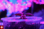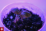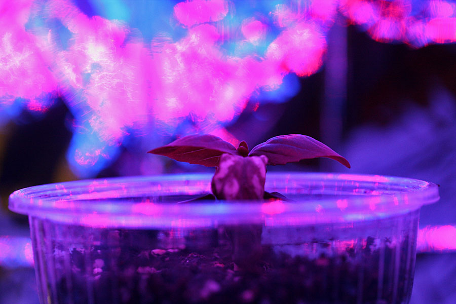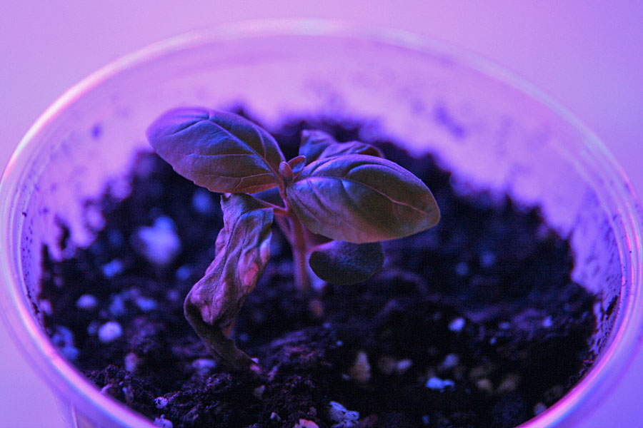it's only been about 24 hours but somehow i'm surprised that the LED basil is still alive and hasn't just shriveled up. one of the weird things about growing under LED's is that the leaves look black under the blue and red lights. it seems very counter-intuitive that under these conditions anything could possibly grow. anyway, check back in a week and see how things progress.