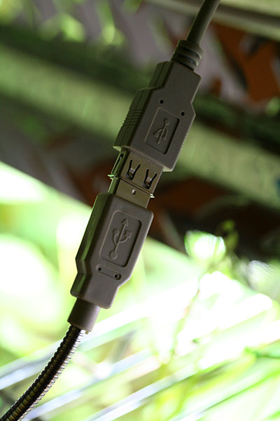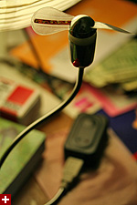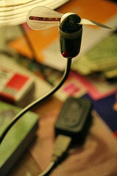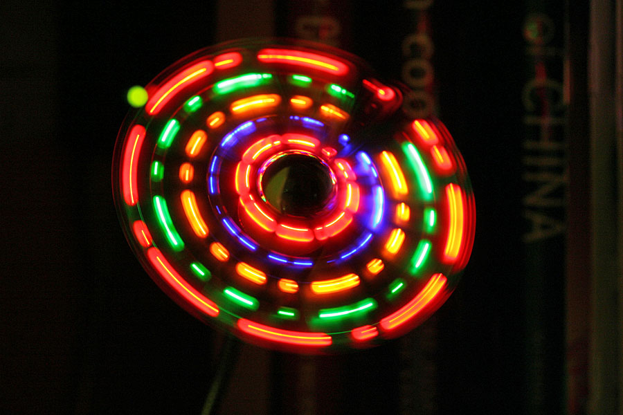 in the package was several USB power adapters and a USB-powered fan with illuminated LED lights and a flexible neck. i got the fan as a cheap way to ventilate my grow closet. the LED lights were something extra but turns out they're the best part of the fan, flashing different colored patterns when you turn it on.