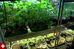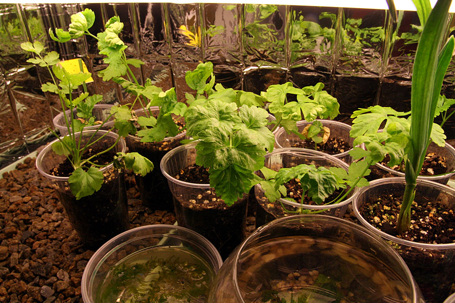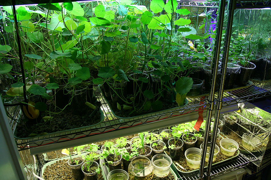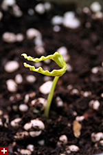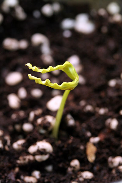it took just 4 days (with an overnight presoak) for the cypress vines to germinate. this is how it's supposed to work! one sprouted enough that i moved it underneath the grow lights while i'm waiting for a second cypress vine seedling to emerge a bit more before relocating. the problem is i don't have very much space on the upper shelf ever since the nasturtiums decided to take over, and the light on the lower shelf is the inferior yellow bath & kitchen fluorescence, and i know the cypress vines won't do very well with those.