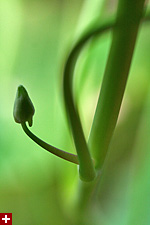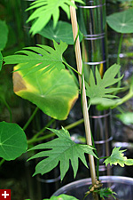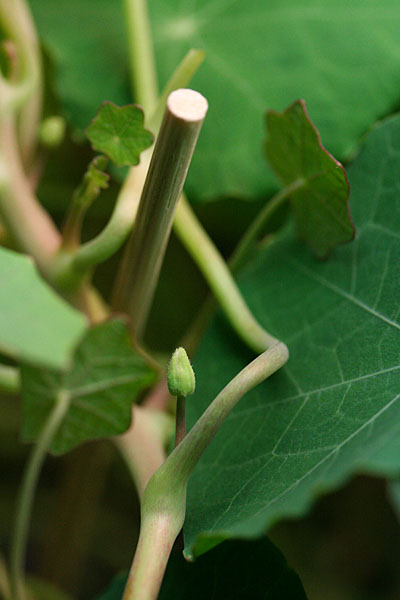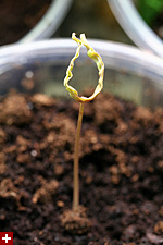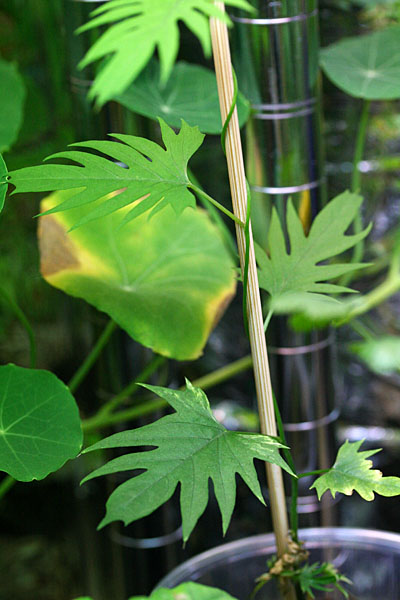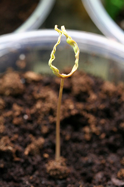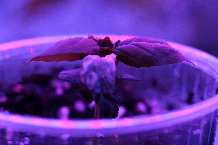 with the myriad of different colored lights shining and flashing in my grow closet, it really is like a carnival in there. i'm noticing more and more nasturtium flower buds. frankly, i didn't think any of the nasturtiums would flower unless i decreased the daily amount of light so they think it's later in the artificial growing season. but another thing that makes plants flower is when you stress them. if they think they're about to die, they start making flowers like crazy in an attempt to make some seeds before they're gone. that must be the case here. as for the cypress vines, i added two more to my collection yesterday and the fourth and last should be emerging within the next few days (i checked beneath the soil, a seedling is definitely growing).