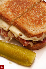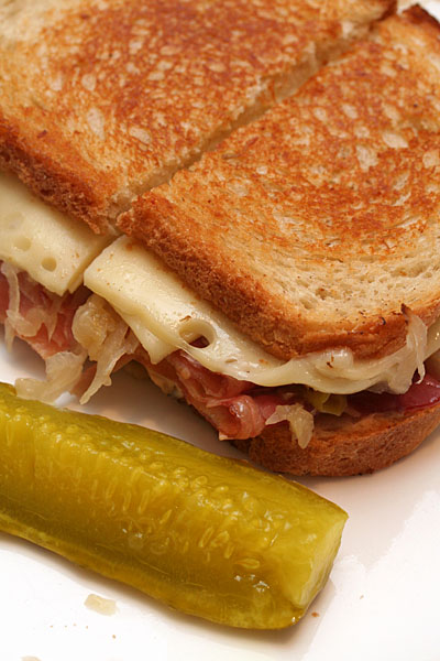 for lunch (which i had close to 4pm) i made some french toast along with some kielbasa sausages. julie was supposed to come over for dinner but she's been immobilized at home for the past few days due to a pinched nerve, a direct result of an overactive lifestyle. when i talked to her she was just about to pick up her prescription muscle relaxant. i made myself a reuben sandwich.