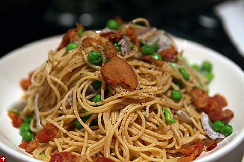i made some pasta alla carbonara. the recipe looked more delicious than the actual result. it seemed like a vegetarian pasta: a mixture of peas, onions, and whole wheat angel hair pasta, with just a dash of bacon. instead of cooking it over the stove, julie tried to make some more bacon using the microwave, resulting in a grease fire that left the kitchen a bit smelly before i blew out the smoke with a fan.