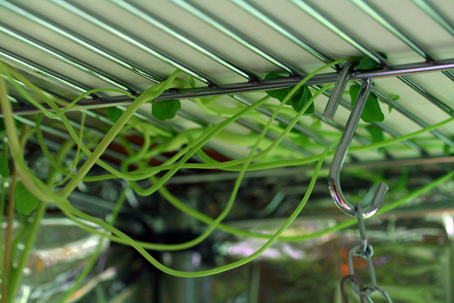 there comes a time in every indoor gardener's life to call it quits. i don't think i'm going to get anymore out of the plants i already have. i have some edible cilantro and parsley, i never did grow enough basil to eat (most of their leaves have since shriveled up), and the nasturtiums have pretty much taken over the closet. once the cardinal climber vine starts flowering (i hope soon), i'm going to get rid of most of my nasturtium to make room for transplant crops. (actually, just when i wrote that, i've decided against it, i'll leave the nasturtiums until they produce seeds and in the meantime i'll grow my transplant vegetables on the lower shelf, with hopefully better lighting.)