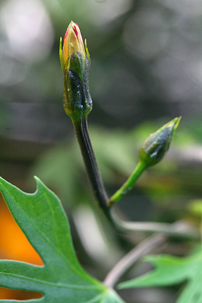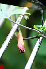 just waiting for the cardinal climbers to bloom. i found an almost blossoming bud today, hidden between the two fluorescent bulbs. i'm still curious how plants know when to flower. i thought it was two things: period of light and living conditions. if you give them less light, or somehow stress them by watering less, the plants will think the growing season is about to be over and start making flowers. that's my theory at least. however, living in my grow closet, where the conditions are kept constant, what triggers these plants to flower?
