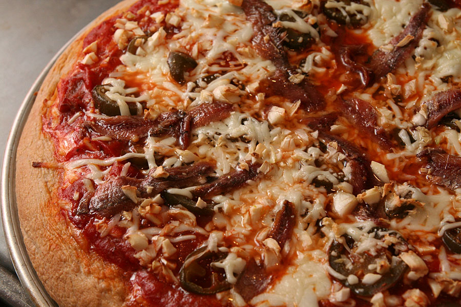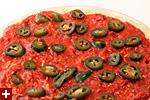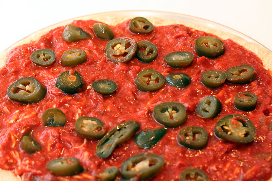 a layer of mozzarella cheese, followed by a layer of tomato sauce. i topped that off with hot pepper slices, then another layer of mozzarella cheese. on top of that i added anchovies and chopped garlic from 6 cloves. into the preheated oven at 450°F for 20 minutes.