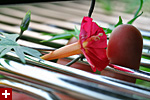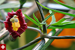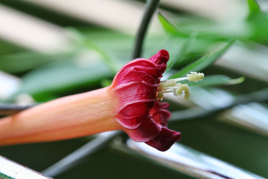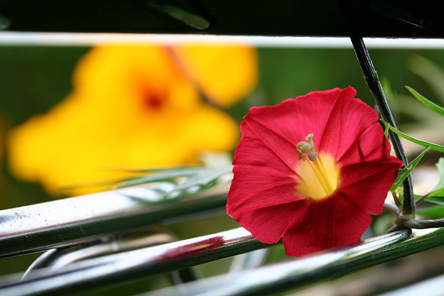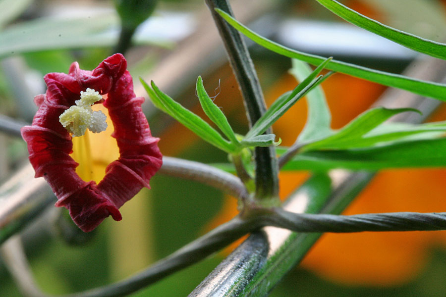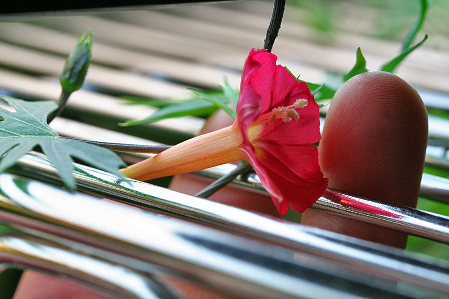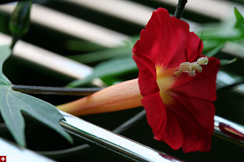 after eliza left, i got a chance to examine one of the cardinal climber flowers that finally bloomed today. shapewise it resembles its morning glory cousins, the familiar pentagon outline. sizewise, it's a much smaller flower, with a diameter about the same as a nickel. there's no discernible fragrance but it was hard for me to get my nose into the wire shelf (morning glories are known for their scents anyway).
