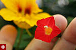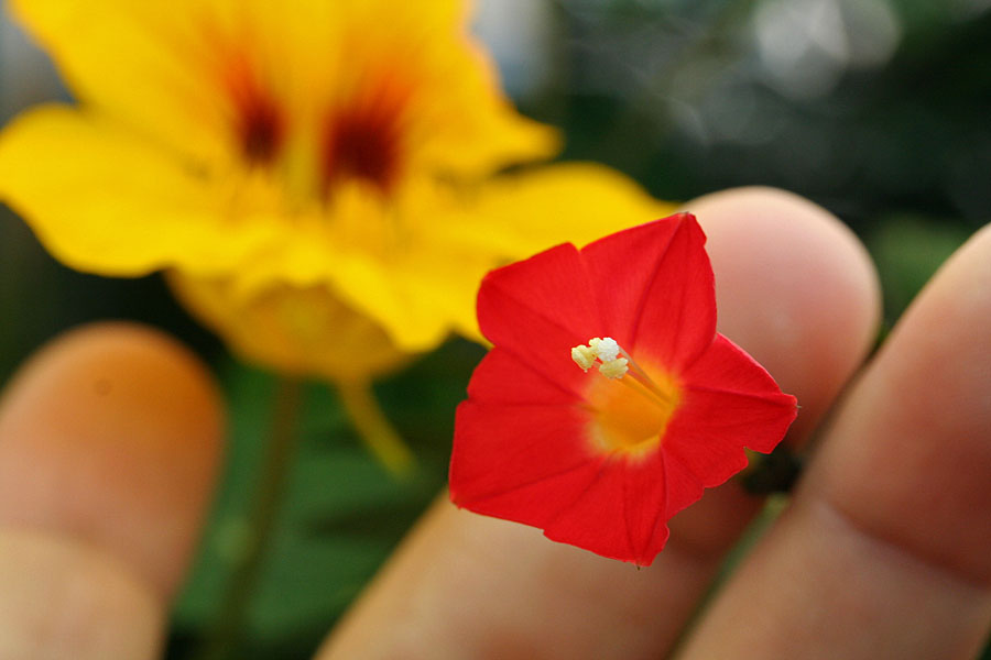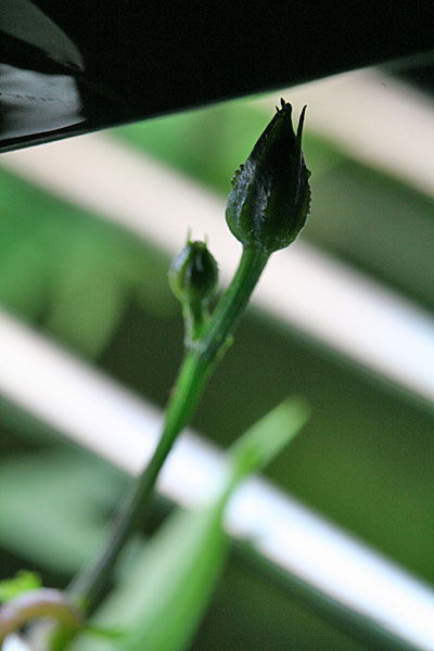 2 new cardinal climber flowers blossomed this morning. i noticed when i examined the stems that the flower buds seem to grow in pairs for some reason, and there was even one with 3 buds.
