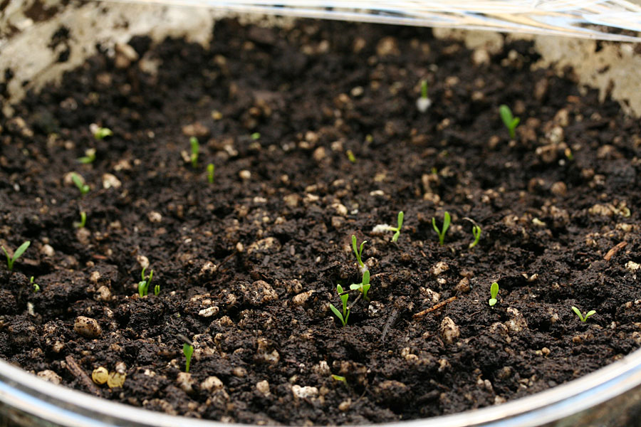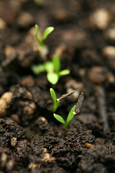 there's new plant activity in my indoor garden. i was surprised to find that some of the seedlings i planted 5 days ago had already sprouted. most of the giant thai hot peppers have emerged, and i relocated them from the dark guest bedroom to the well-lit grow closet. later i was surprised to see that the coreopsis (coreopsis tinctoria to be exact) had sprouted as well, since they weren't supposed to come out until after 7-30 days. judging from the seedlings, they were probably out yesterday, so it only took 4 days until germination. maybe it had something to do with 160 watts of light, since i put them in the closet due to lack of growing space. i'm still waiting for the tomatoes and the tomatillos to join the party.