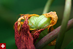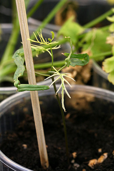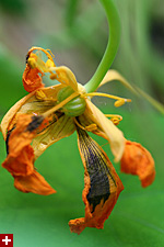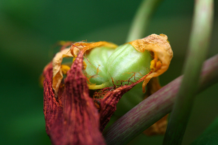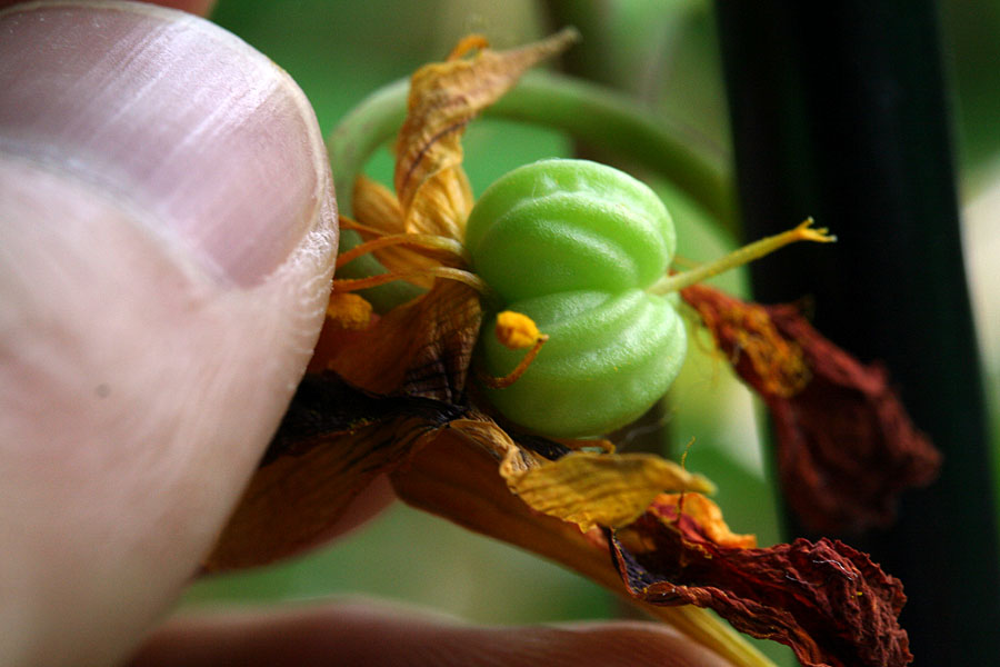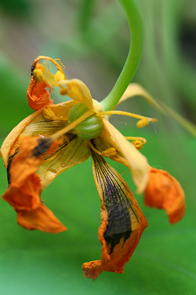 some of the nasturtium flowers have transformed into nasturtium seed pods. they're not ripen yet, probably still a few more weeks. i wonder if my manual attempts at pollination had anything to do with it? occasionally i take a piece of tissue, roll it up into a wand, and swab the various flowers, imagining that i was a bee. also tonight i saw my first red nasturtium flower. there have been deep orange flowers that were close to red, but this was definitely red. unfortunately it doesn't photograph well (both orange and red look the same in photos) so no pictures.
