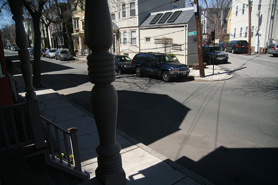 there was street cleaning on my side of the street today. of course having been towed before, i'm hyperaware of what day it is, and last night parked my motorcycle in a safe place. sometime in the afternoon, after the street had already been cleaned, i looked out the window and saw something really interesting. the position of the sun was casting shadows of the houses all the way down my street. the shapes of each houses was clearly visible, something i'd never seen before because normally there'd be cars parked along the street.