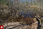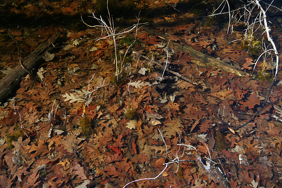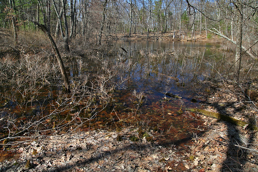 finally i found it. it's not marked on the trail map, other than a large patch of swamp. it's hidden inside the forest, but surprisingly obvious once you make out what looks to be a pond a few hundred yards down an embankment. i'm not even really sure if it's even a vernal pool, except there doesn't seem to be any fish, and the bottom of the pool is all leaf debris. i didn't see any fairy shrimps (which would indicate this was a vernal pool), but those critters show up fairly early in the season and then quickly disappear (so i've read).