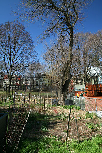 before visiting the community garden. i figured the place would be pretty crowded on such a nice day, but there was nobody there. i took the time to clean up my plot a little bit, throw away all the dried plant stems from last season. i also took some photos of the mulberry tree near my garden, before the city chops it down.