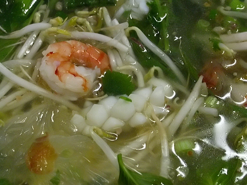 we ended up going to a vietnamese restaurant called T&M, diagonally across the street from city hall. it looked like a good place because it was packed with southeast asians. our waitress (who also appeared to be the owner) brought out a dish of complimentary youtiao. she sensed we weren't local and asked where we were from. i decided to order a pork noodle soup and julie ordered something similar. when julie's order arrived she had a hard time eating it because the noodles were transparent. i volunteered to trade soups with her (mine were opaque).