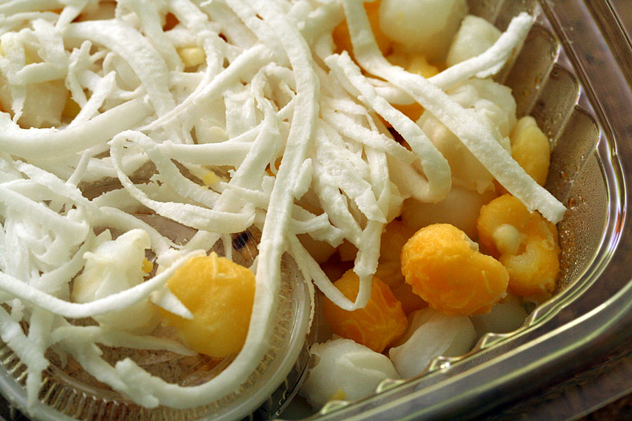 after battambang market, we visited 888 supermarket. although much smaller, it has things that battambang doesn't have, like homemade chili dipping sauce and southeast asian kimchee. oh, one more thing: baluts! the ones we saw last time looked like a package of duck embryos including the uterus. this time we actually saw them selling whole eggs, which we can assume with half-formed duck embryos inside of them. 888 also sold these southeast asian beef jerky. i thought they tasted okay but were really dry and brittle, like you could smash it into a million pieces with a hammer.